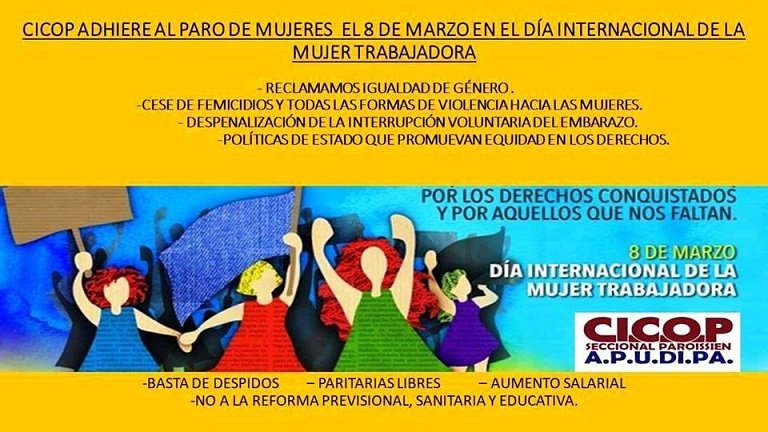 La seccional de CICOP del Hospital Paroissien, APUDIPA , adhiere al paro y marcha de las mujeres el 8M. La organización de profesionales de salud llama a sus afiliados a concentrarse en Av. de Mayo y Bernardo de Irigoyen a las 16:30hs para participar en la marcha del Congreso a Plaza de Mayo que realizaran las mujeres en Capital Federal para conmemorar el Día Internacional de la Mujer Trabajadora. Basta de despidos, paritarias libres, aumento salarial y no a la reforma previsional, sanitaria y educativa son alguna de las consignas que proclaman para esta jornada de las mujeres argentinas.