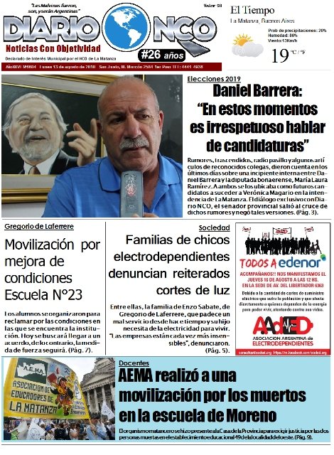 #BuenLunes Portada impresa de Diario NCO del 13-08-2018.