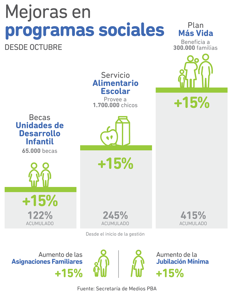 Dijo además que, hasta agosto, el gobierno provincial había incrementado la partida presupuestaria destinada a la asistencia social en unos 700 millones de pesos, y que ahora se sumarán otros 500 millones para ampliar el monto de los productos “que reciben los comedores escolares, aumentar el plan Más Vida, el plan alimentario más importante de la Provincia, y subir las jubilaciones mínimas y las asignaciones familiares, para llegar casi al 40 por ciento en lo que va del año”.