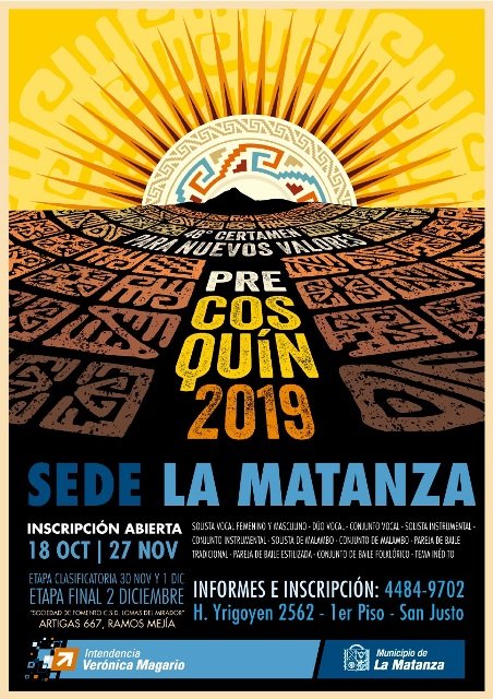Por 18º año consecutivo, el Municipio de La Matanza es sede del certamen más importante de Latinoamérica y convoca a los artistas a participar, de manera gratuita, en los diferentes rubros: Solista Vocal Masculino y Femenino; Dúo Vocal; Conjunto Vocal; Solista Instrumental; Conjunto Instrumental; Solista de Malambo; Conjunto de Malambo; Pareja de Baile Tradicional; Pareja Baile Estilizado; Conjunto de Danzas y Tema Inédito