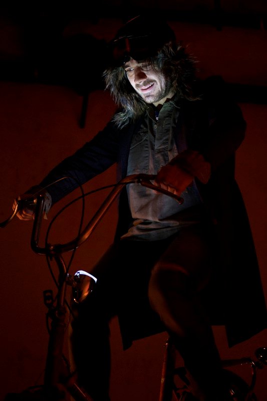 Víctor Chacón: “La obra surge a partir de la idea de que el actor tiene un trabajo físico frente a un grupo de personas que está inmóvil. Desde ahí pensé un texto que tenga como conflicto la generación de energía para un grupo de desconocidos, a partir de esa idea y charlando con un colega platense surgió la idea de un actor activando una bicicleta a dínamo para iluminarse. A medida que fui escribiendo el texto surgieron los otros dispositivos que generan luz y de ahí se intentó hacer una obra donde los actores se iluminan a partir de su actividad física. Muchas veces mirando teatro el espectador se olvida de que las personas trabajando en escena tienen un desgaste físico, que el actor pone el cuerpo; en ésta obra los actores tienen una exigencia física que impacta en el espectador al punto de que cuando salen de la sala nos comentan que se preocupaban por si algún actor se había lastimado realmente.