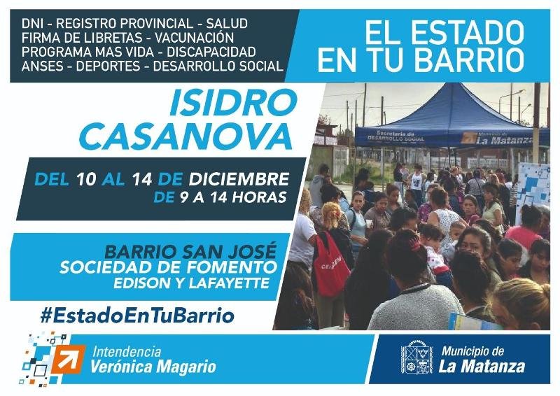 Desde el lunes 10 hasta el viernes 14 de diciembre, de 9 a 14, el operativo El Estado en tu Barrio se traslada a la localidad de Isidro Casanova para instalarse en la Sociedad de Fomento del Barrio San José ubicada en Edison y Lafayatte en donde los vecinos se podrán acercar para asesorarse sobre políticas públicas, servicios y realizar diferentes trámites.