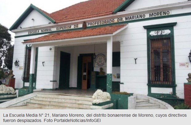 La Escuela Media N° 21, Mariano Moreno, del distrito bonaerense de Moreno, cuyos directivos fueron desplazados. Los 130 alumnos de 6º año del Colegio Mariano Moreno, de la localidad homónima, recibieron sus diplomas, con la consigna de que cada uno eligiera una canción, un símbolo musical, que los representara en momentos de recibir en manos la distinción por su paso en la Escuela Media.