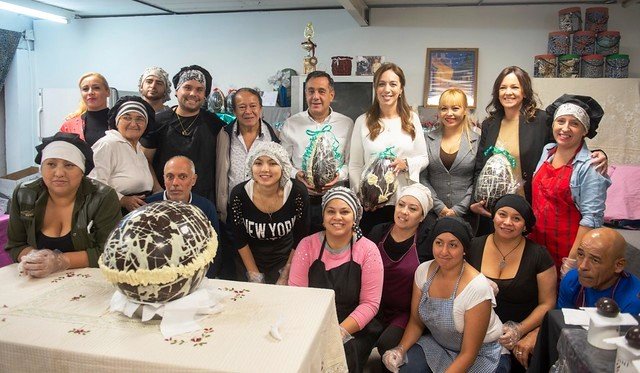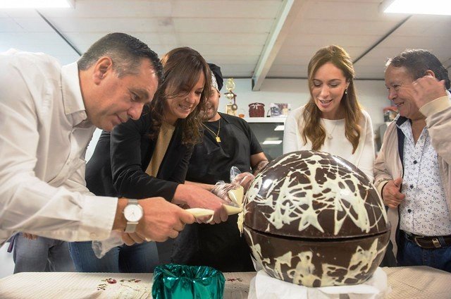 Alejandro Finocchiaro junto a la gobernadora María Eugenia Vidal y Carolina Stanley, aprendieron y participaron de los pasos de elaboración de los huevos de Pascua que producen los trabajadores de la cooperativa La Juanita, en Gregorio de Laferrere, con el anfitrión Toty Flores.