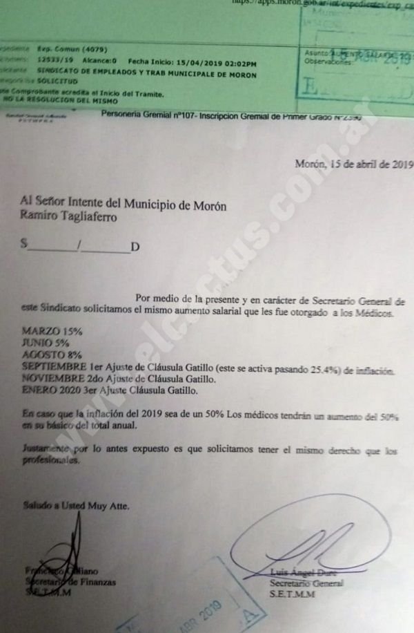 Desde el Sindicato de Empleados y Trabajadores del Municipio de Morón presentaron una nota dirigida al intendente Ramario Tagliaferro donde solicitan la misma recomposición salarial que tuvieron los médicos y las médicas del Hospital Municipal.