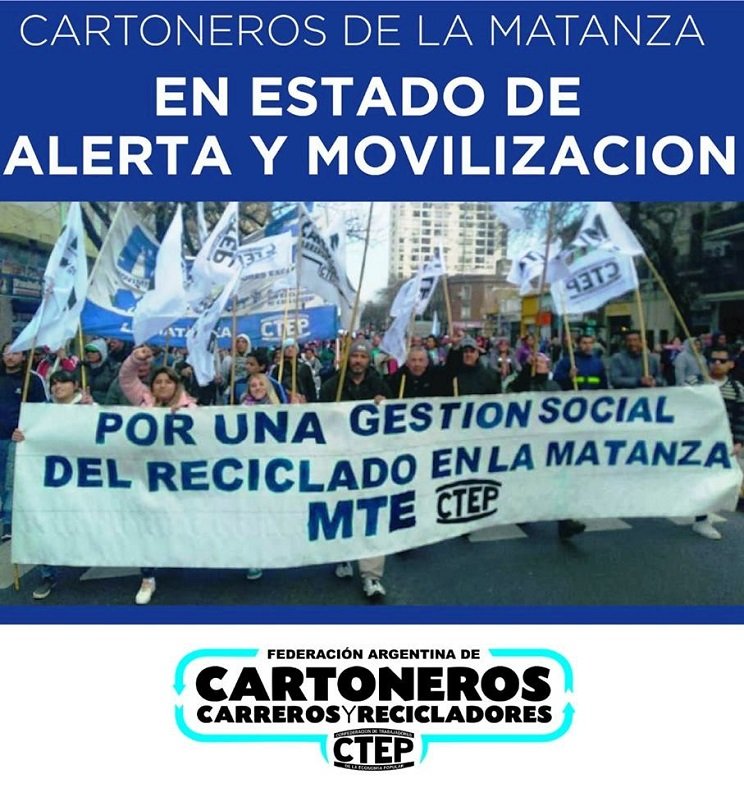 Los cartoneros (Trabajadores del Reciclado) informan en un comunicado, que se declaran en estado de alerta y movilización por incumplimiento del Municipio de La Matanza de los acuerdos realizados para regularizar esa actividad.