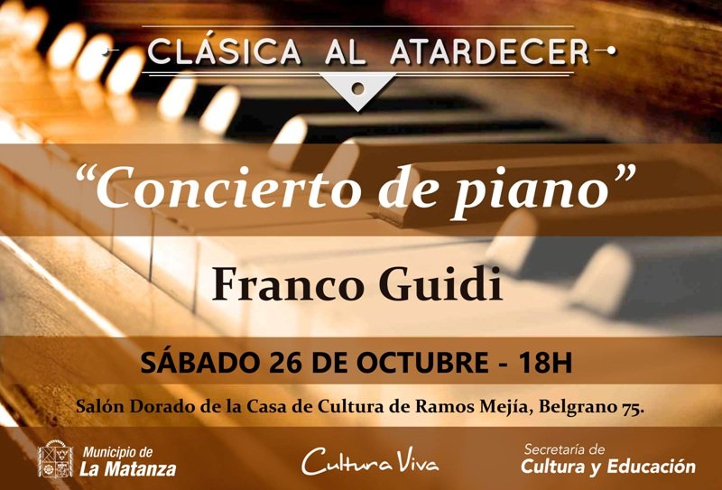 Organizado por la Secretaría de Cultura y Educación de La Matanza, el ciclo Clásica al Atardecer presenta al joven pianista Franco Guidi que desplegará todo su talento a través de su calidad interpretativa y deleitará al público con una cuidada selección de composiciones entre las que podremos escuchar la Segunda Sonata de Brahms y la Sonata en si menor de Liszt.