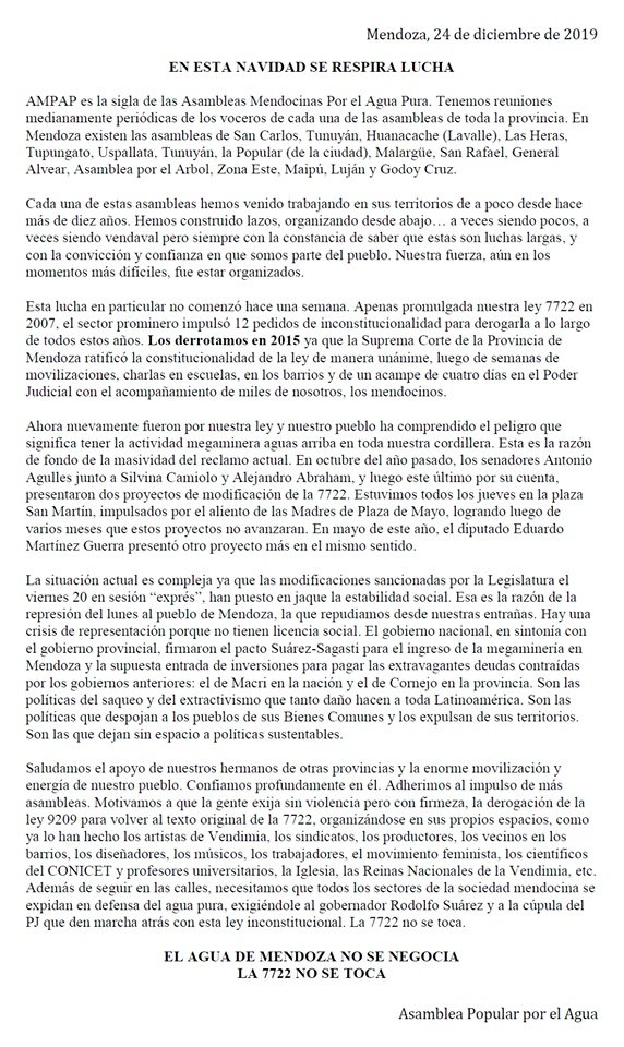Por su parte, las Asambleas Mendocinas Por el Agua Pura (AMPAP) siguen reclamando el veto de las reformas de la Ley 7722 que ya fueron publicadas en el Boletín Oficial de la provincia, y lanzaron un comunicado en el que expresaron su repudio.