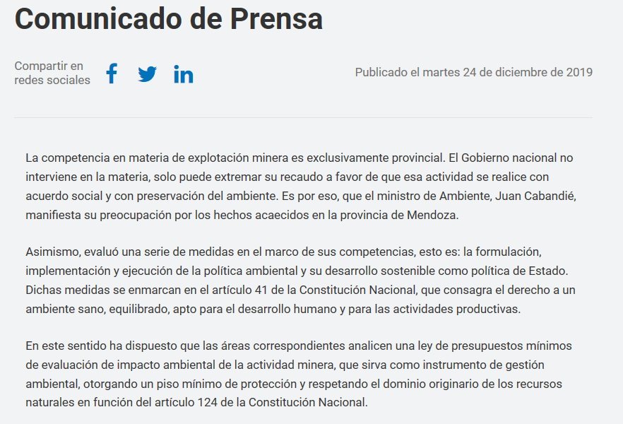 El texto expuso: “La competencia en materia de explotación minera es exclusivamente provincial. El Gobierno nacional no interviene en la materia, solo puede extremar su recaudo a favor de que esa actividad se realice con acuerdo social y con preservación del ambiente”.
