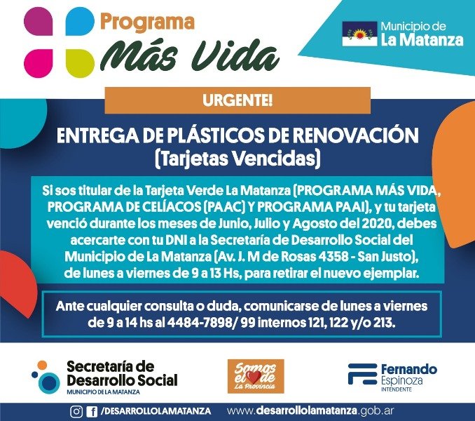 La Secretaría de Desarrollo Social del Municipio de La Matanza comunica que todos los vecinos y vecinas titulares de la Tarjeta Verde del Plan Más Vida La Matanza, del Programa de Asistencia Alimentaria al Paciente Celíaco (PAAC) y del Programa de Asistencia Alimentaria Inmunodeprimidos (PAAI) del distrito cuya tarjeta haya vencido durante los meses de JUNIO, JULIO Y AGOSTO del corriente año deben acercarse a la Secretaría para retirar el nuevo plástico.