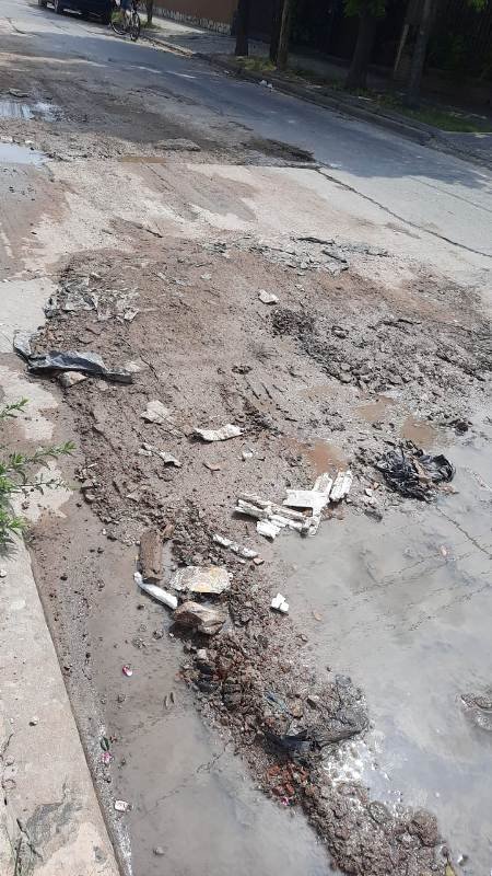 En la continuidad de la charla, la entrevistada disparó que “son cráteres llenos de barro y escombros puesto por los vecinos. El año pasado se empezó a agrietar el pavimento y este año directamente se hundió. Hoy tenés 20 centímetros de hundimiento. Cuando pasan autos que no son de la zona y no conocen la profundidad se escucha el golpe seco que hacen”.