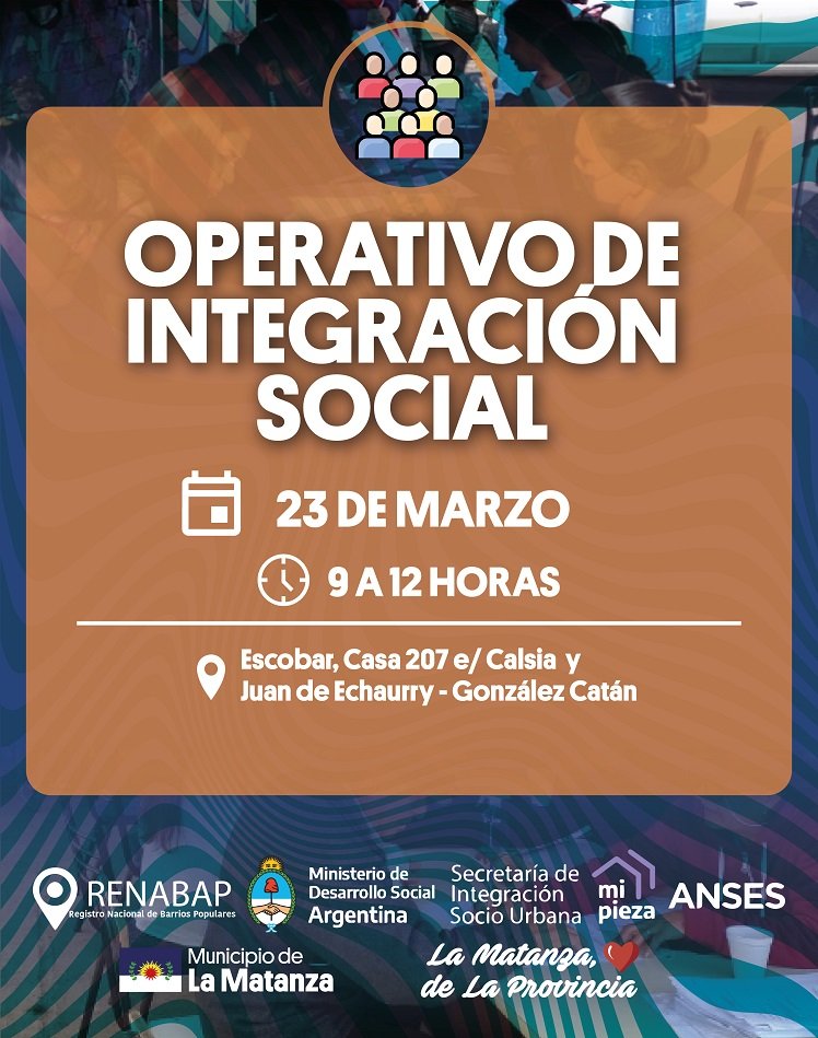 Todos los operativos se desarrollan de 9 a 12 Hs en Escobar, Casa 207, entre Calsia y Juan de Echaurry (González Catán) para que los vecinos y las vecinas realicen o se asesoren sobre diversos trámites como RENABAP y MI PIEZA, y que puedan acceder a controles de salud.