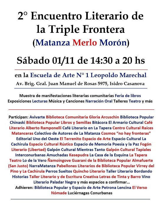 El próximo sábado primero de noviembre, de 14:30 a 20 horas, se realizará el 2° Encuentro Literario de la Triple Frontera en la Escuela de Arte N°1 “Leopoldo Marechal” (Avenida Juan Manuel de Rosas 5975, Isidro Casanova).