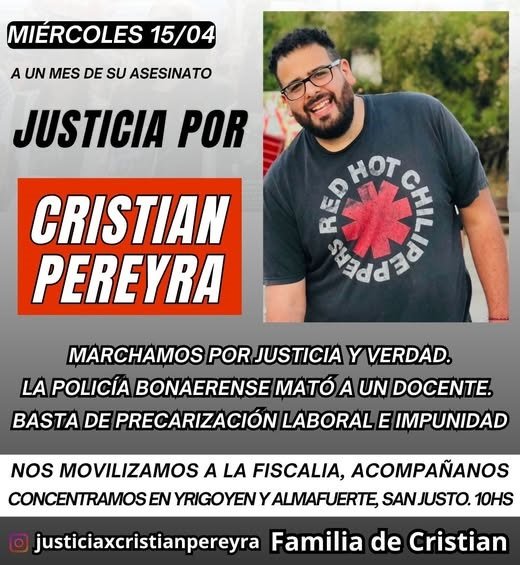 La concentración es hoy 15 a las 10 hs. en Yrigoyen y Almafuerte, San Justo, para marchar a la fiscalía a cargo de la investigación donde, a las 11 hs, la familia tendrá una entrevista con el fiscal Adrián Arribas. Estarán acompañados en la marcha por el gremio docente, organizaciones de derechos humanos y vecinos y vecinas de Cristian.